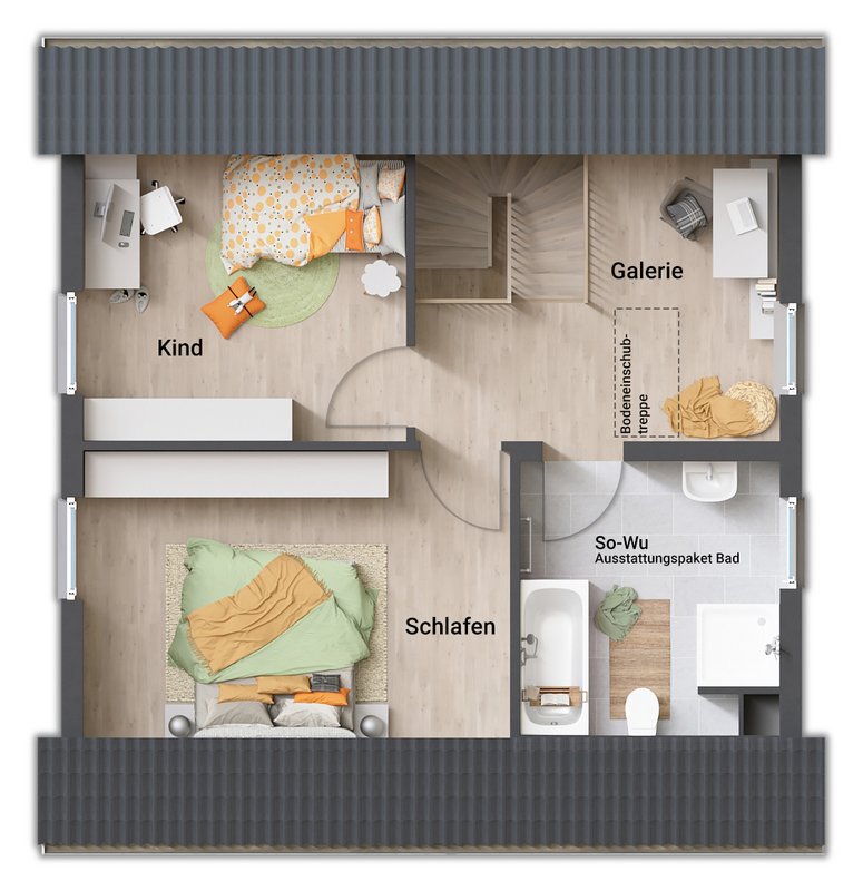 Im Erdgeschoss knüpft die offene Küche direkt an das Wohn-/Esszimmer an, während auf der Straßenseite ein Hauswirtschaftsraum und Gäste-WC Platz finden. Das Obergeschoss begrüßt dich mit einer Galerie für deine Hobbys oder deinen flexiblen Arbeitsbereich. Ein Bad, Kinder- und Schlafzimmer runden das Dachgeschoss ab.